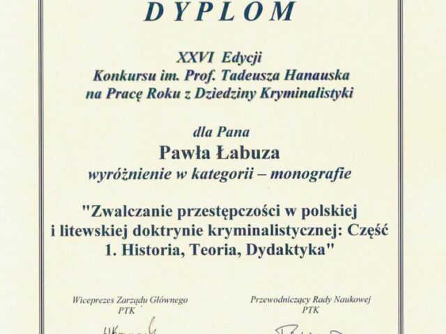 XXVI Edycja Konkursu im. Prof. Tadeusza Hanauska na Pracę Roku z Dziedziny Kryminalistyki przyniosła naszej wspólnocie akademickiej wyjątkowy powód do dumy. W gronie wyróżnionych znalazł się Dziekan Wydziału Nauk Społecznych, Humanistycznych i Ochrony Zdrowia PANS w Przemyślu – dr Paweł Łabuz, który zaszczytne wyróżnienie otrzymał za pracę naukową pt. „Zwalczanie przestępczości w polskiej i litewskiej… Czytaj więcej »